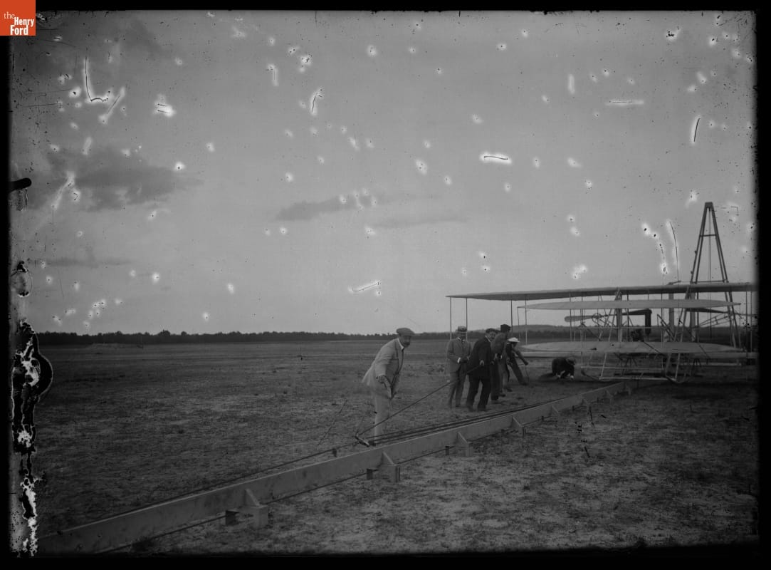 Positioning the Wright Flyer on the Launch Rail, France, 1908-1909