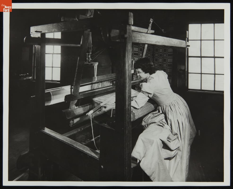 Craftspeople have presented weaving demonstrations at Greenfield Village since it opened to the public in 1933. Over the years, weavers have used several historic and refurbished looms located in the Plymouth Carding Mill (now Gunsolly Carding Mill) to create hand-crafted textiles. These presentations and resulting products help tell the story of textile production in America.