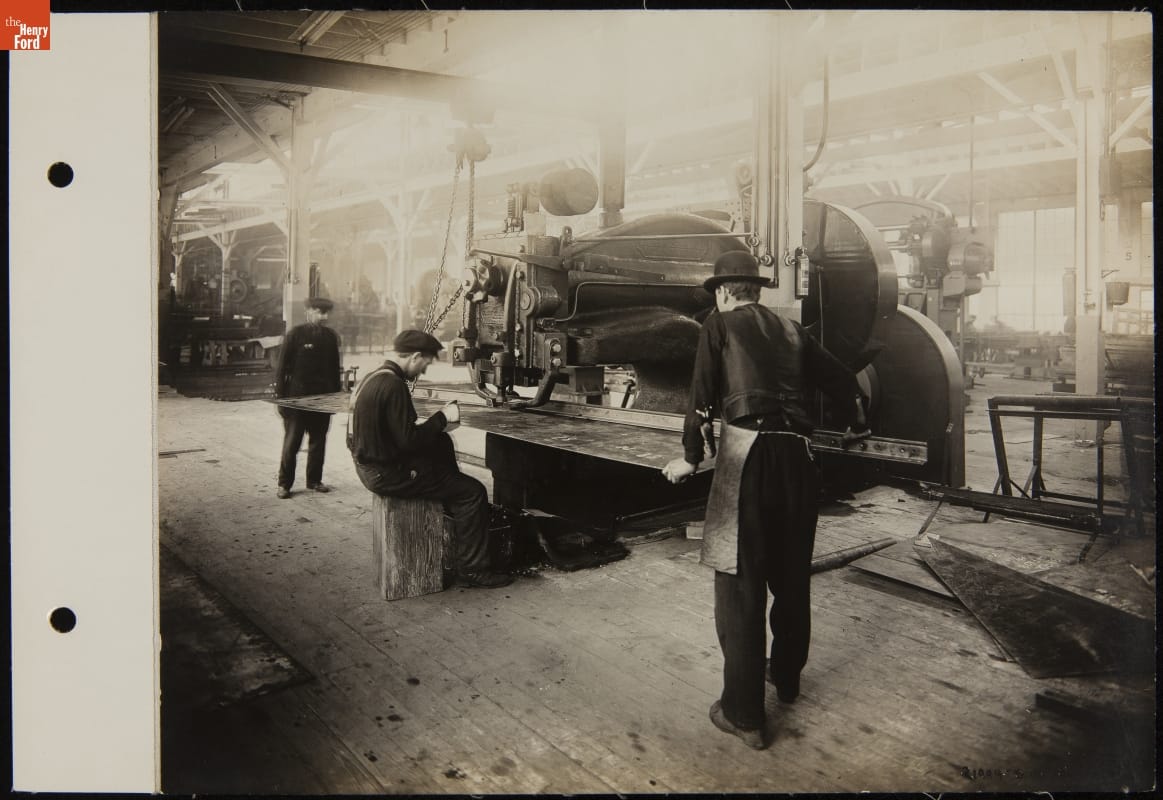 The first vehicles built at Ford Motor Company's Rouge factory weren't automobiles but boats. These Eagle boats were designed to challenge German submarines during World War I, but they saw only limited action before the armistice. Here workers prepare a section of sheet steel for use in an Eagle boat. Sixty Eagles were produced between May 1918 and October 1919.