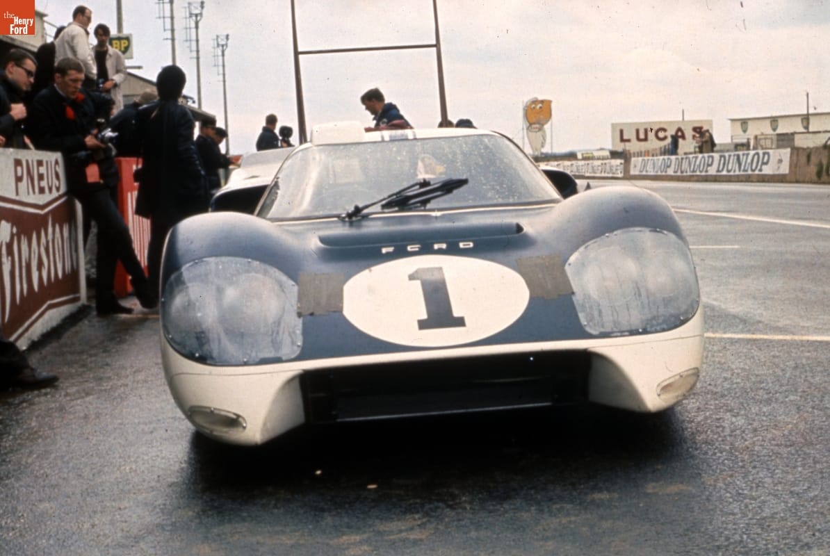 Ford Motor Company intended to compete at Le Mans in 1967 with the all-new J-Car, seen here during an April 1966 trial in France. Those plans changed in August 1966 when Ken Miles died in a rollover accident while testing a J-Car at Riverside, California. Ford engineers and Shelby American specialists reworked the J-Car into the safer, sounder Mark IV.