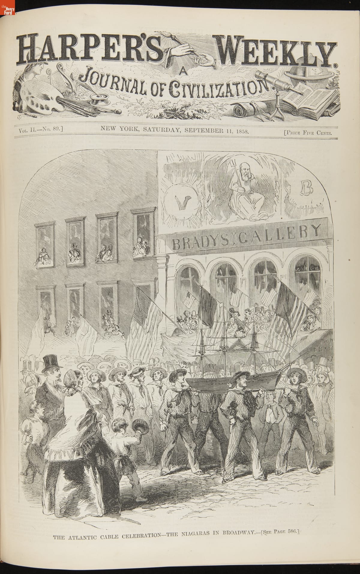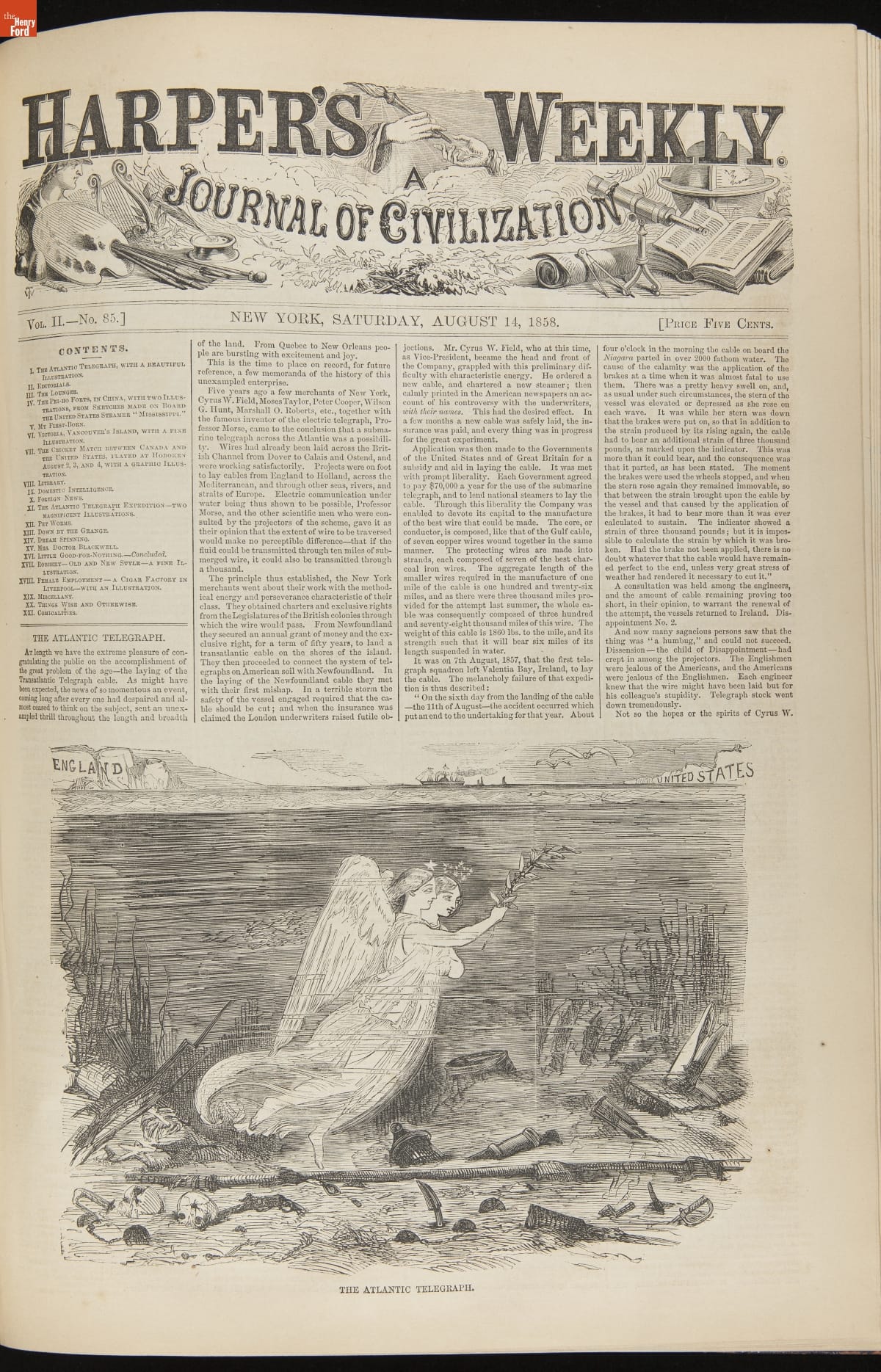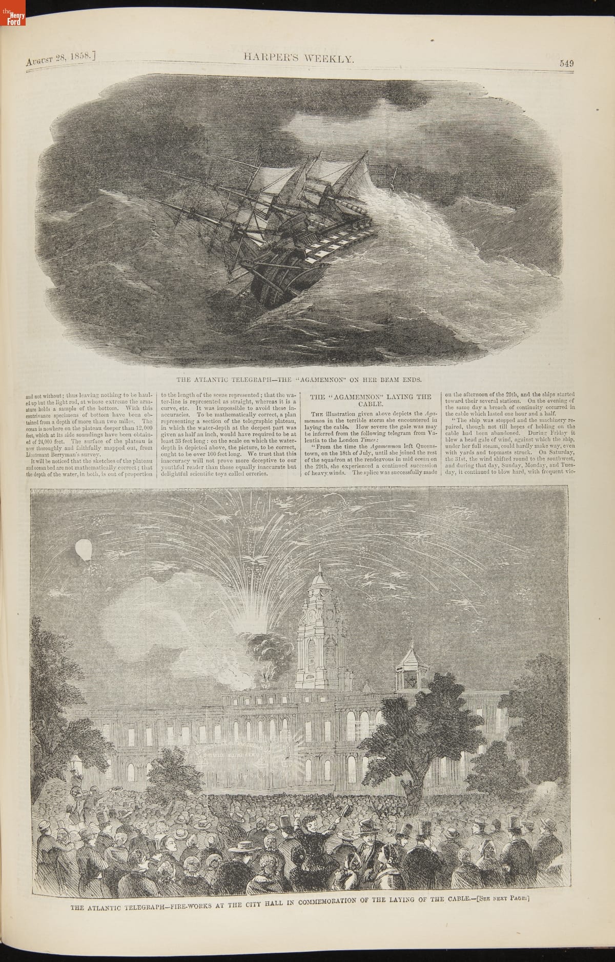 This periodical shows a fire at New York City Hall on August 18, 1858. To celebrate the successful transmission of messages over the transatlantic cable September 1 was declared as an "International Cable Jubilee" day. New York City began its commemorations early, setting off a display of fireworks. Sparks ignited the dome of City Hall, destroying part of the building.