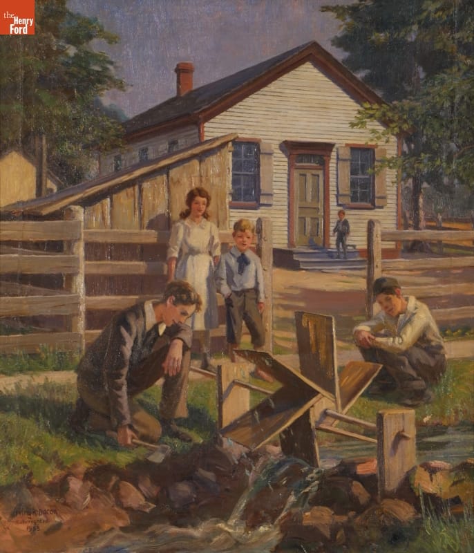 Henry Ford had his favorite artist Irving Bacon paint several scenes Henry remembered from his childhood. This painting depicts a dam and a waterwheel Henry and a group of friends installed in a small stream. Behind them is the Miller School building, which a grown up Henry had replicated at Greenfield Village.