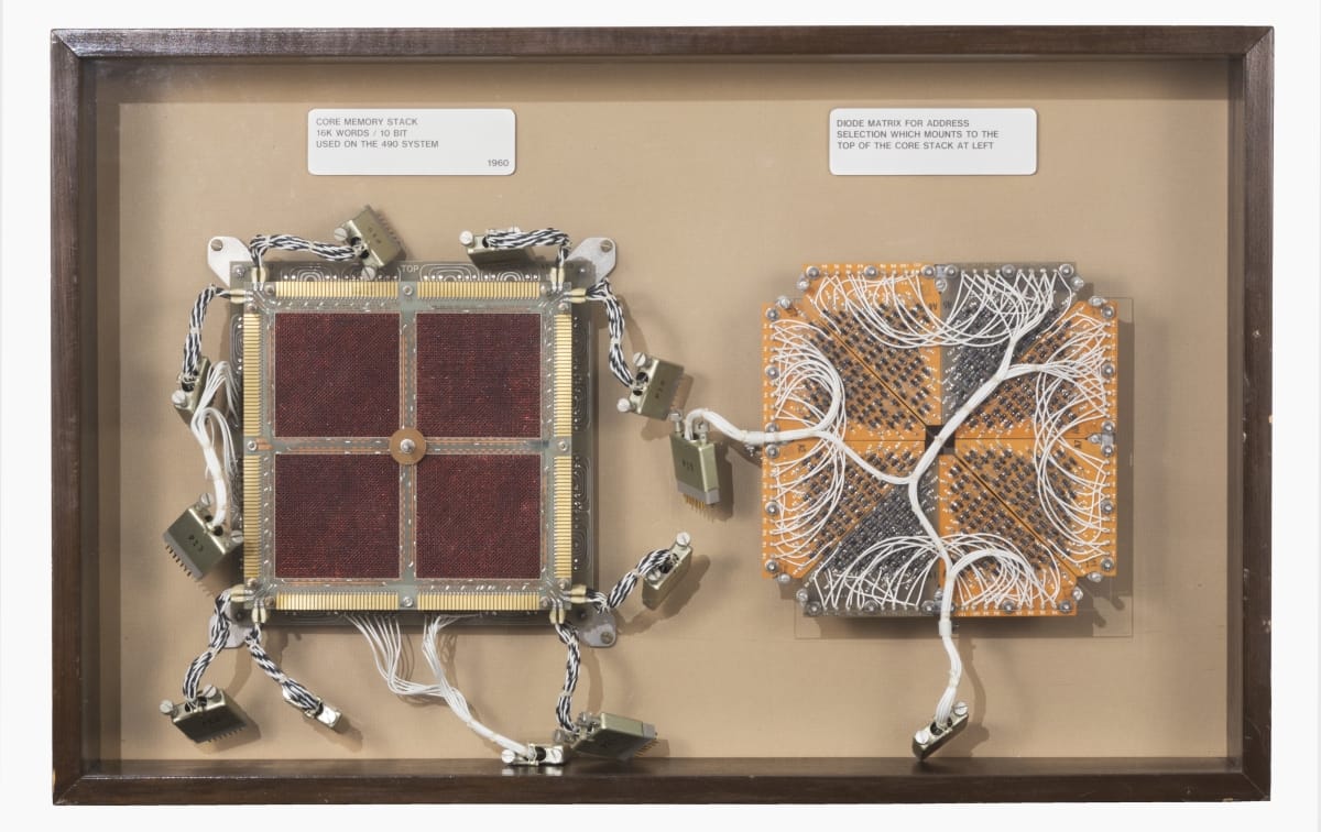label above left object: CORE MEMORY STACK / 16K/10BIT / USED ON THE 490 SYSTEM / 1960 label above right object: DIODE MATRIX FOR ADDRESS SELECTION WHICH MOUNTS TO THE TOP OF THE CORE STACK AT LEFT