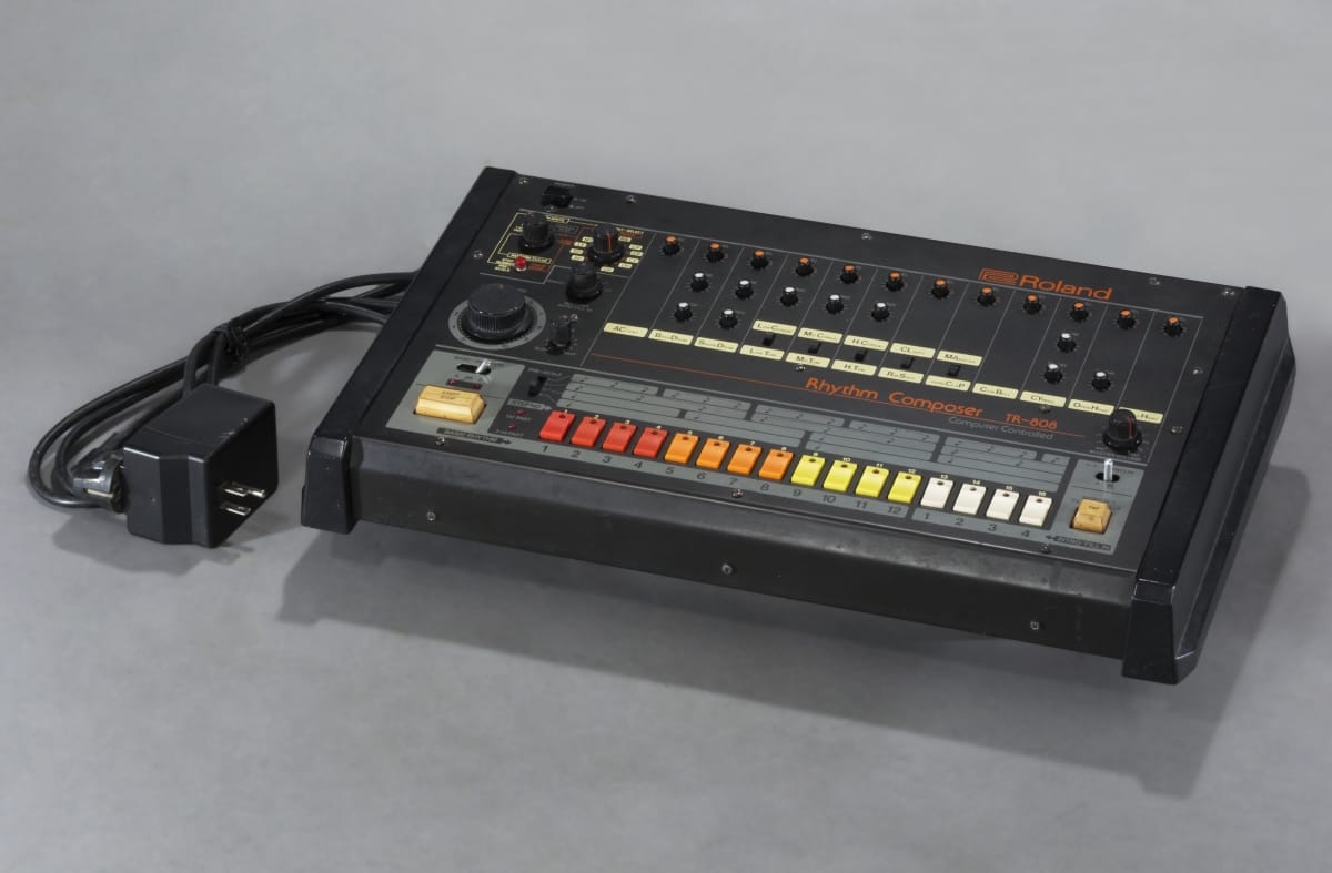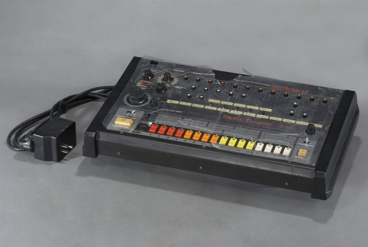 on top of drum machine: Roland / Rhythm Composer TR-808 / Computer Controlled plate on back of drum machine: WARNING: SHOCK HAZARD / --DO NOT OPEN plate on back of drum machine: AC 220V 50/60HZ 8 W / MODEL TR-808 / SERIAL NO. 238792 / Roland Corp. MADE IN JAPAN on back of converter: REVERSE CONVERTER / 120VAC 60 Hz 75 W INPUT / 240 VAC 60 Hz 75 W OUTPUT / CAUTION - FOR INDOOR USE ONLY / NEUTRAL FLOATING / VOLTAGE VALET / [...] / Model No. V75R 315