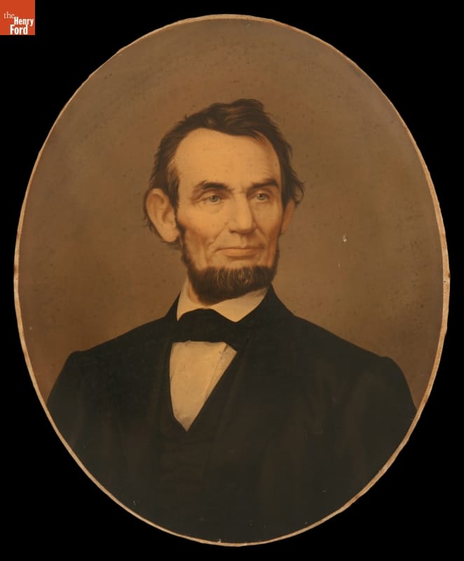 A color lithograph bust portrait of a bearded President Abraham Lincoln. E.C. Middleton & Co. of Cincinnati, Ohio made this print to resemble a painting by printing it on paper with oil-based color inks, then varnishing and gluing it onto canvas. They then attached it to an oval wooden stretcher and placed it in a decorative picture frame. This ornamental piece often found a place in the home parlor for many Americans along with their framed family portraits. This print was a popular way to honor and remember President Abraham Lincoln. The Middleton company first produced this print in 1863. The portrait was so popular that they kept making the printed portraits after Lincoln's assassination. It was an accepted way to mourn his death and honor his leadership during the Civil War.