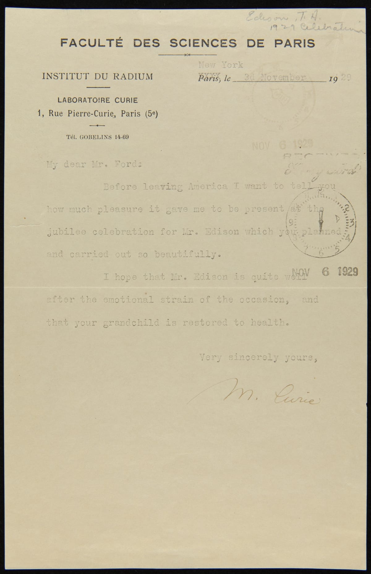 Letter from Marie Curie to Henry Ford regarding Light's Golden Jubilee, November 3, 1929