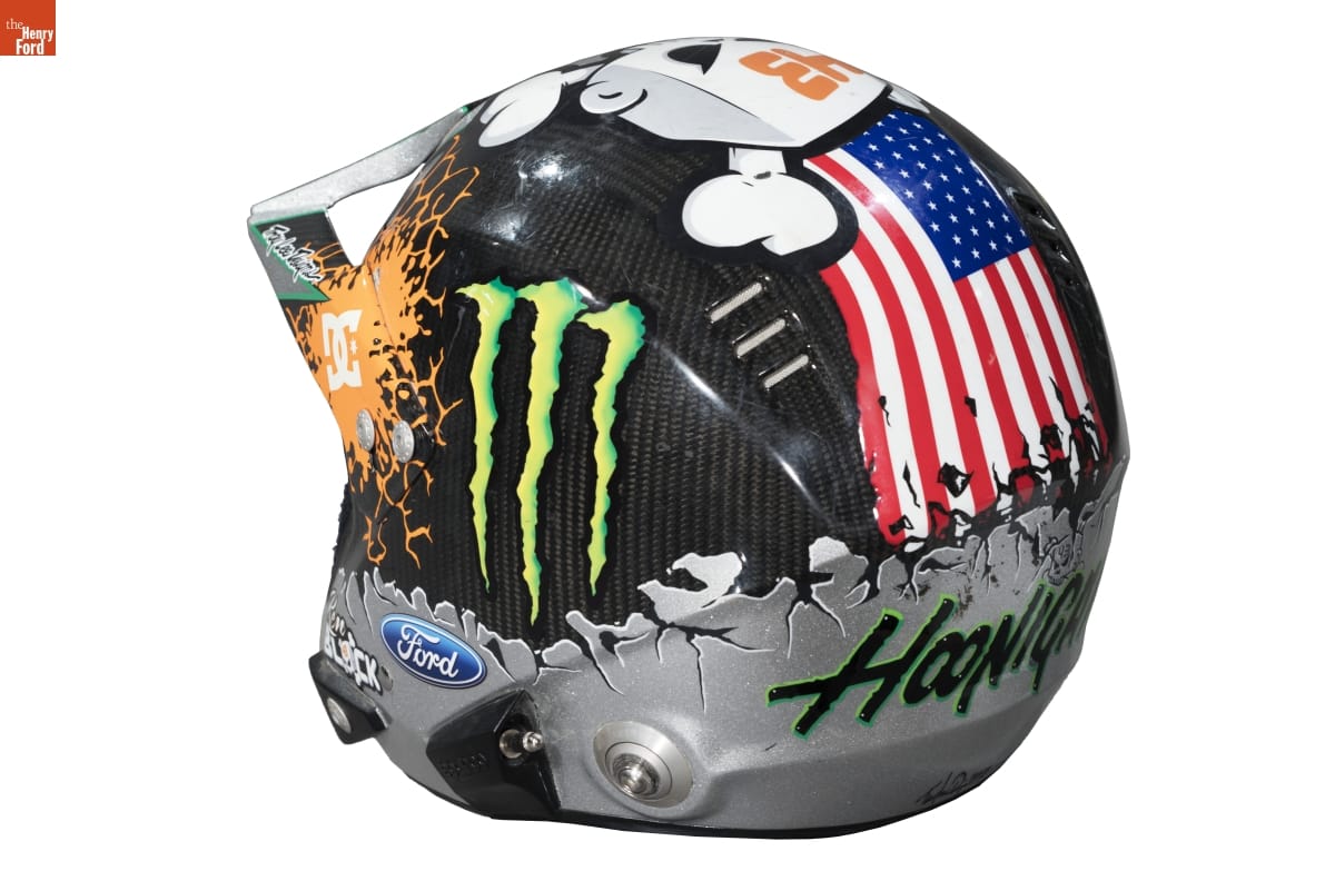 Rally driver Ken Block redefined motorsport with his wildly popular Gymkhana film series. Each video featured Block performing elaborate stunts in exciting locations, and together they racked up hundreds of millions of views online. Block wore this helmet in 2012's Gymkhana Five: Ultimate Urban Playground; San Francisco, a tire-shredding tour through the City by the Bay.
