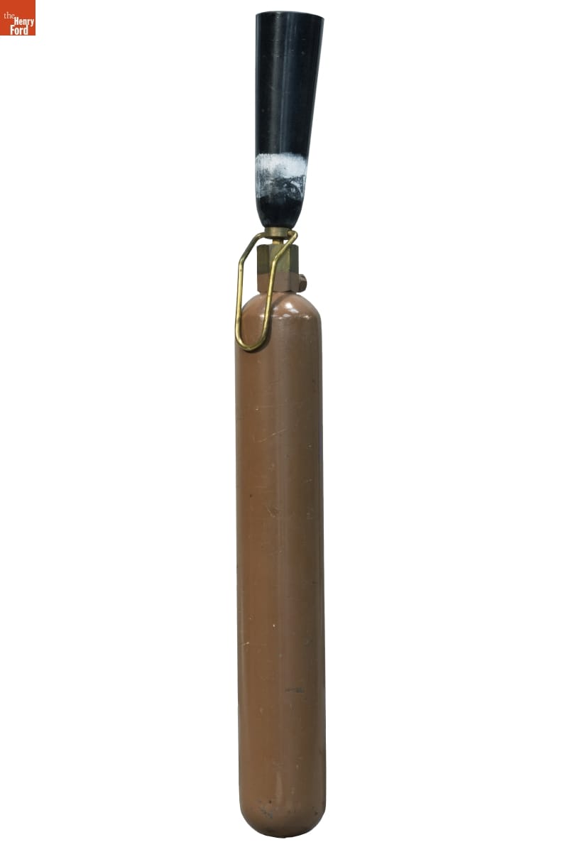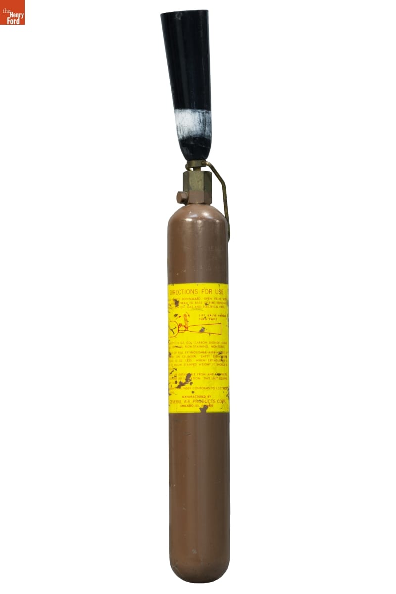 on front: DIRECTIONS FOR USE / HOLD NOZZLE DOWNWARD. OPEN VALVE WIDE / AND DIRE[CT S]TREAM TO BASE OF FIRE. ESPECIALLY / EFFECTIVE ON OIL, GAS AND ELECTRICAL FIRES. / LIFT VALVE HANDLE / THEN TWIST / CAPACITY - 10 OZ. CO2 (CARBON DIOXIDE) CLEAN, / SAFE, ODORLESS, NON-STAINING, NON-TOXIC. / W[EI]GHT OF FULL EXTINGUISHER (LESS NOZZLE) IS / STAMPED ON CYLINDER. EMPTY EXTINGUISHER / WEIGHS 10 OZ. LESS. WHEN EXTINGUISHER IS / SIX OZ. BELOW STAMPED WEIGHT IT SHOULD BE / REFILLED. / REFILLS ARE OBTAI[NA]BLE FROM ANY C[?]FIRE EX- / TINGUISHER REFIL[?]ATION. THIS UNIT EQUIPPED / WITH SAF[TE]Y [?] / WARRANTY - CYLINDER CONFORMS TO I.C.C. REGU- / LATIONS. / MANUFACTURED BY / GENERAL AIR PRODUCTS CORP. / CHICAGO 25, IL[LI]NOIS