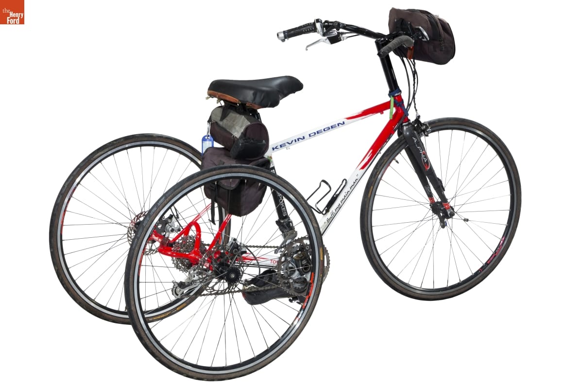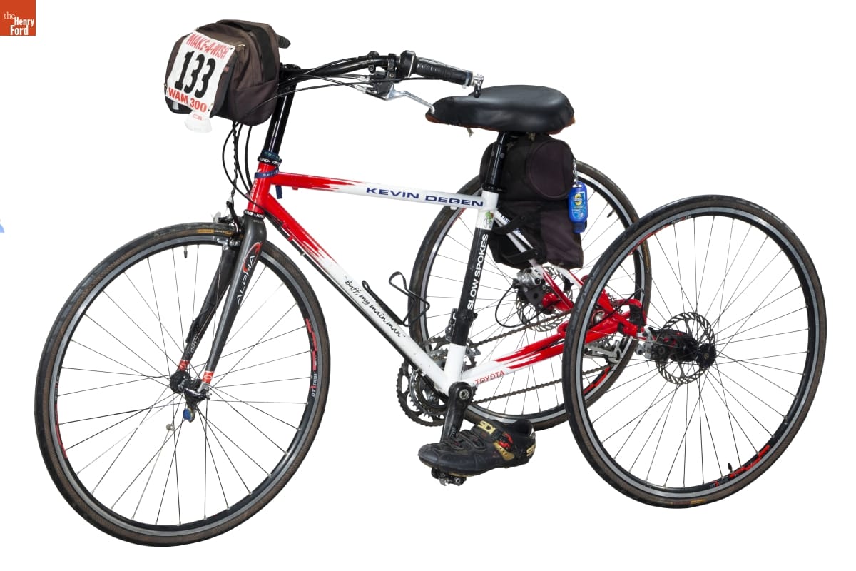 Kevin Degen raised hundreds of thousands of dollars cycling for charitable causes. Degen was born with cerebral palsy and rode using only his left leg and left arm. Toyota engineers designed this tricycle for him. The seat is offset to accommodate Degen's off-center riding posture, and the shift and brake controls are all on the left handlebar.