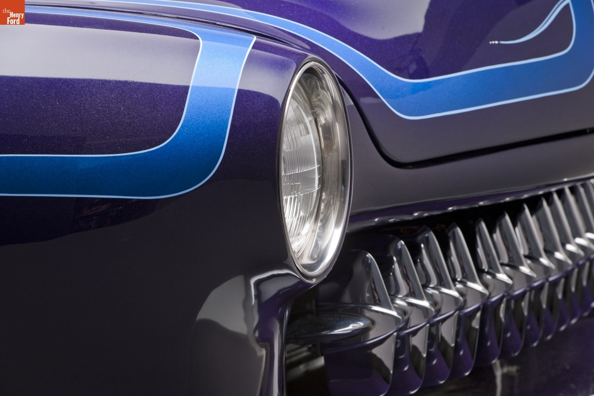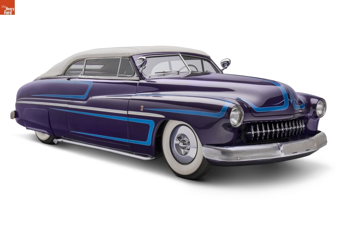Long, low, and well rounded, stock 1949-51 Mercurys became the favorite cars of 1950s customizers. When lowered even more and smoothed out by filling body seams with lead, these Mercs were called "lead sleds." This car shows many early customizing techniques. It was updated in the 1960s with sparkly Metalflake paint and blue "scallops."