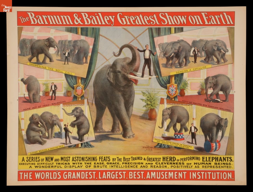 Circus poster printed at top: THE BARNUM & BAILEY GREATEST SHOW ON EARTH Printed at bottom: A Series of New and Most Astonishing Feats by The Best Trained & Greatest Herd of Performing ELEPHANTS. / Executing Difficult Tricks With the Ease, Grace, Precision and Cleverness of Human Beings. / A Wonderful Display of Brute Intelligence and Reason, Positively As Represented. / THE WORLD'S GRANDEST, LARGEST, BEST, AMUSEMENT INSTITUTION Inscribed lower off center: THE STROBRIDGE LITH CO. Cin. N-Y & Lon. Printed upper right on image: B-8