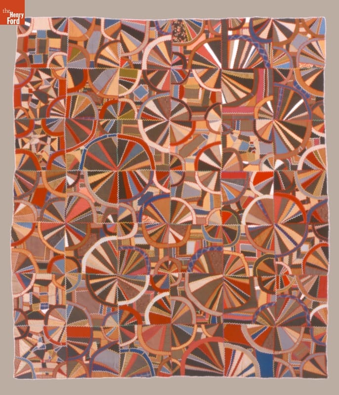 This quilt is a variation of a "crazy" quilt design called fans. Most quilters placed a fan in just one corner of a block. Susan McCord sewed fans of varying sizes in each corner. Then she joined the blocks together to form "wheels" that dazzle with a sense of motion and energy -- a stunning example of this Indiana farmwife's extraordinary design sense.