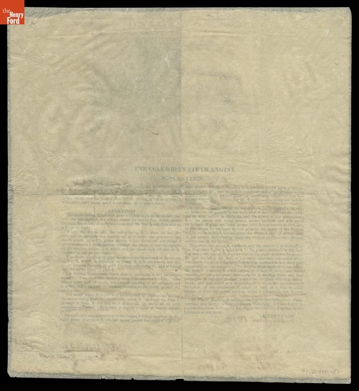 at top: The Columbian Steam Engine. text: KNOW all Men by these presents, That I, Oliver Evans, Steam-Engineer, of the city of Philadelphia, have received of The Marriatta [sic] Steam Mill Co. of the state of Ohio county, state of Ohio --- the sum of Four Hundred eighty dollars--- in full payment for a Steam-Engine, and for License hereby granted to the said Marriatta Steam Mill Co., their heirs, executors, administrators and assigns, to use one of my patented Steam-Engines [...]