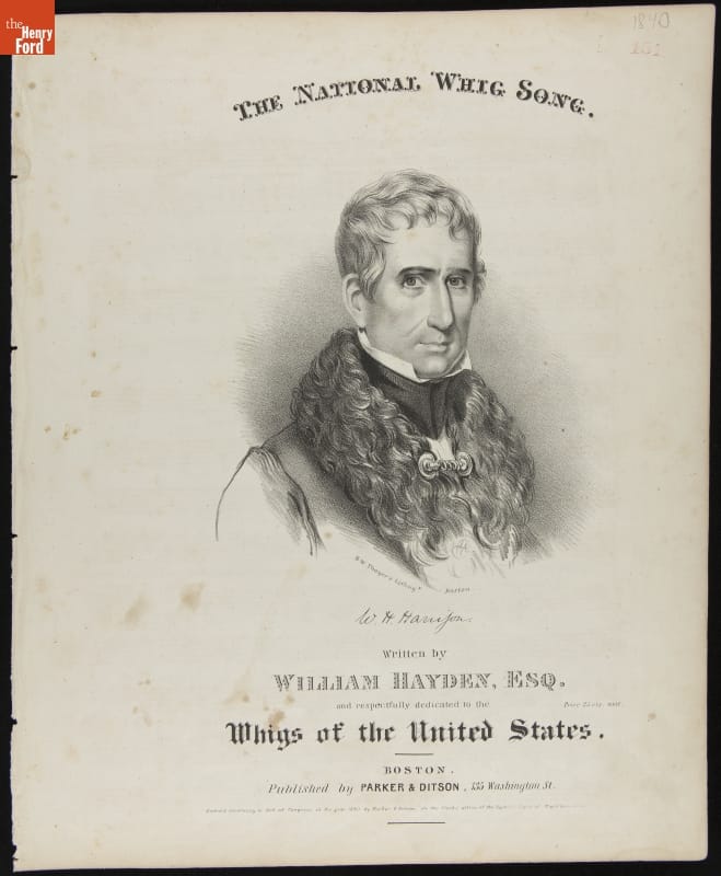 on front cover: THE NATIONAL WHIG SONG. below portrait: B.W. Thayer's Lithogy. Boston. / W.H. Harrison / Written by WILLIAM HAYDEN, ESQ. and respectfully dedicated to the Whigs of the United States. / Price 25 cts. nett. / BOSTON. Published by PARKER & DITSON, 135 Washington St. / Entered according to Act of Congress in the year 1840 by Parker & Ditson in the Clerk's office of the District Court of Massachusetts.