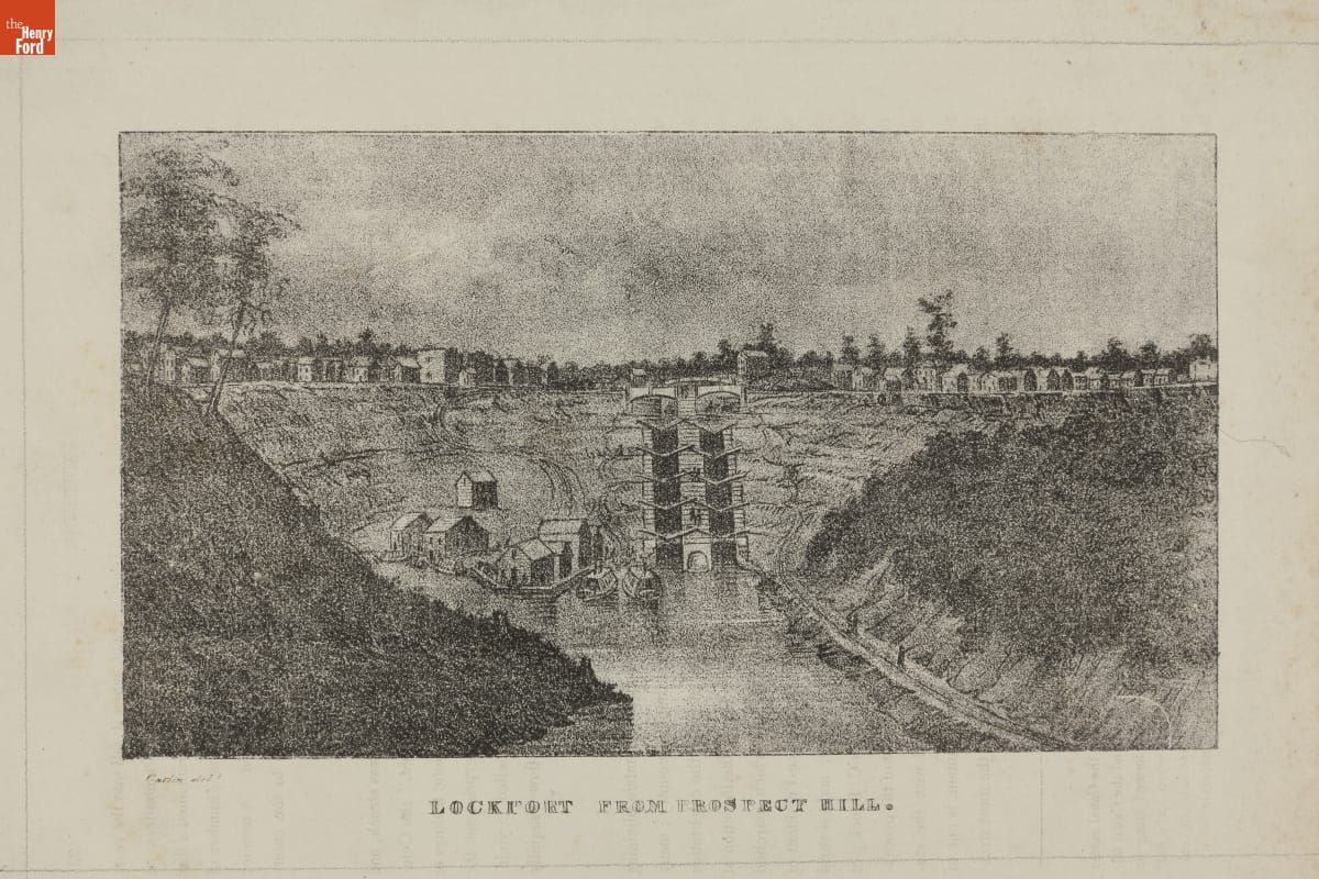 The construction of Erie Canal, connecting the Hudson River to Lake Erie, began in 1817 and completed in 1825, opened the Midwest of the United States to settlement and commerce. This lithograph illustrates a view from Prospect Hill of the locks at Lockport, New York.