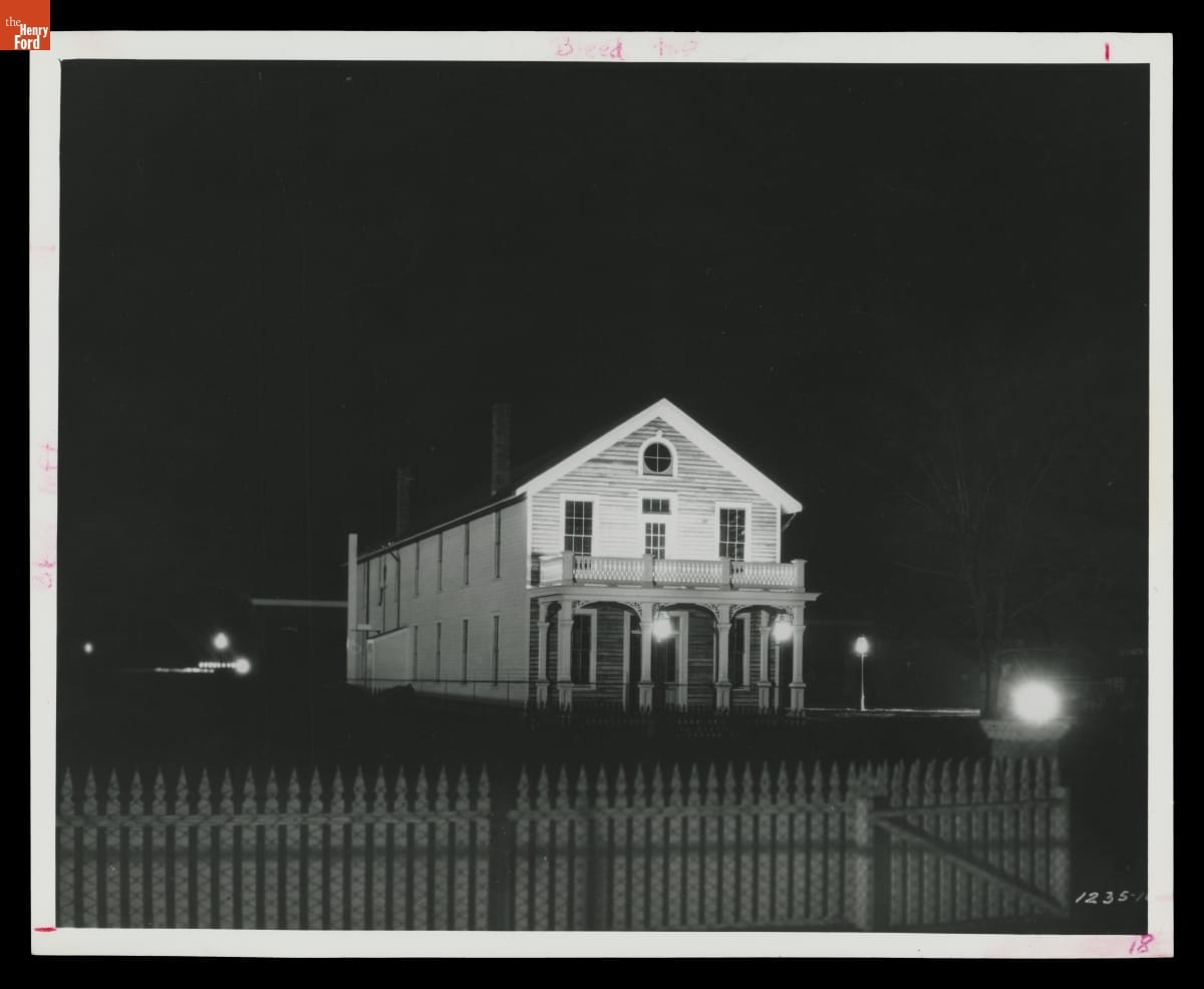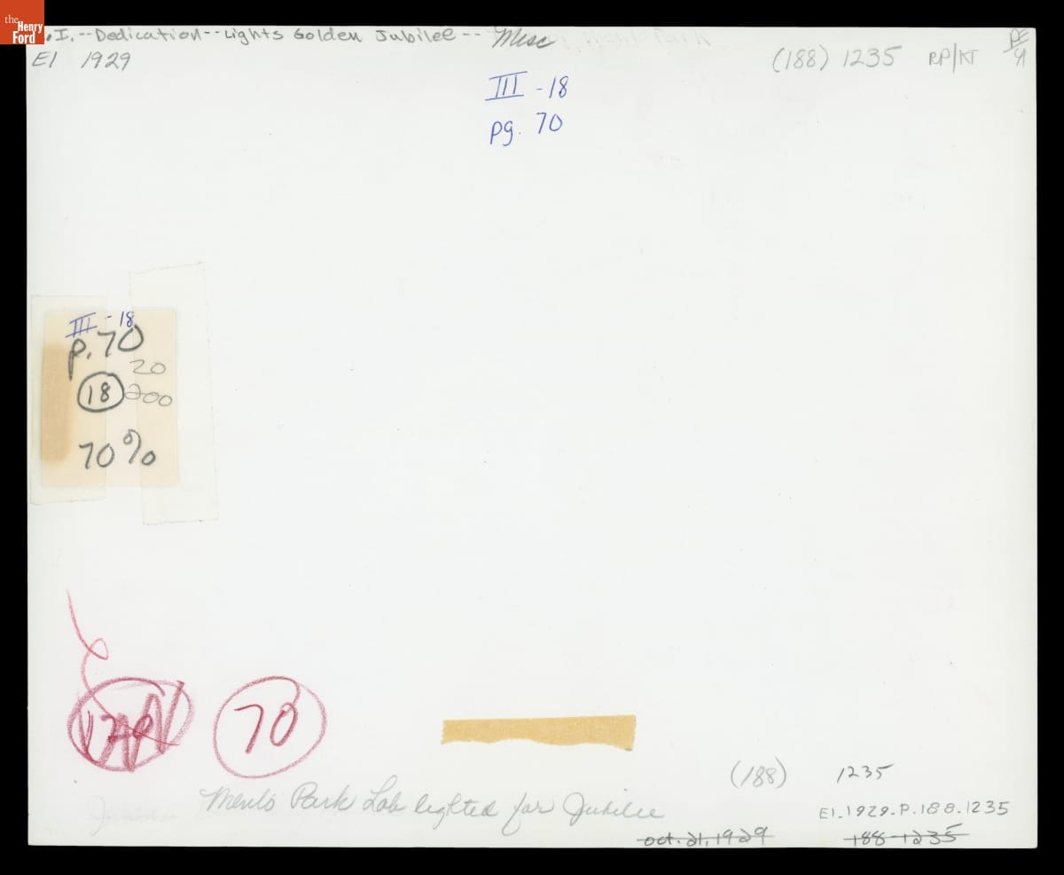 Henry Ford hosted the Light's Golden Jubilee to celebrate the 50th anniversary of the incandescent electric lamp and officially dedicate the Edison Institute of Technology (Ford's village and museum in Dearborn, Michigan) to his dear friend, Thomas Edison. This photograph shows a nighttime lighting rehearsal in preparation for the gala on October 21, 1929.