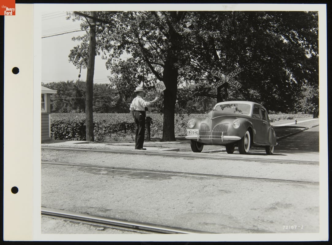 Car Stopped by Guard at Railroad Crossing, August 1939