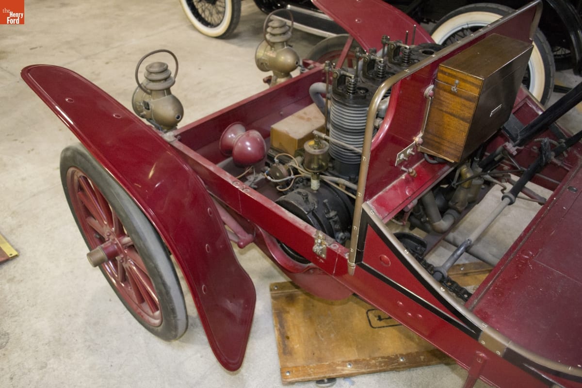 The Franklin Automobile Company of Syracuse, New York, manufactured luxury cars from 1902 until 1934. Franklins were inventive machines. This 1905 runabout is distinguished by its air-cooled engine, which eliminated the need for a radiator. The engine is mounted transversely under the hood so that each of the four cylinders is cooled equally as the car travels.
