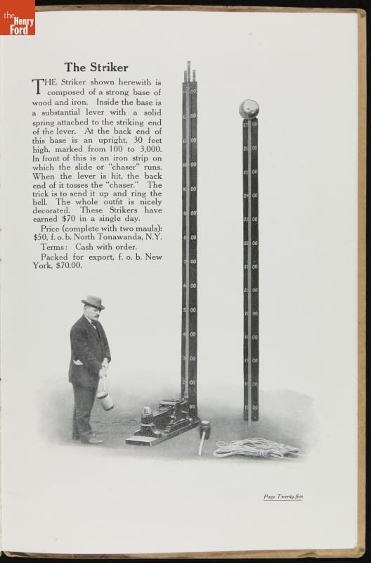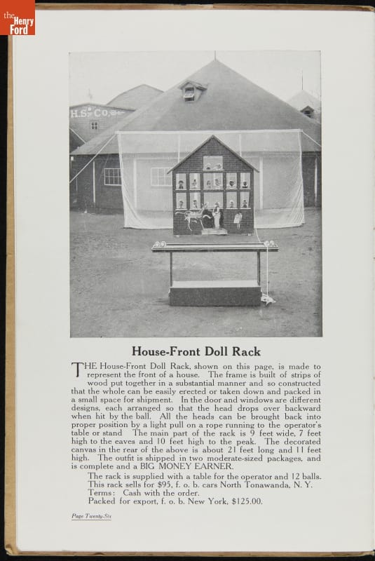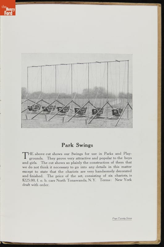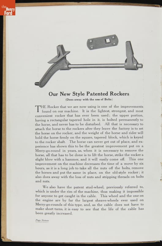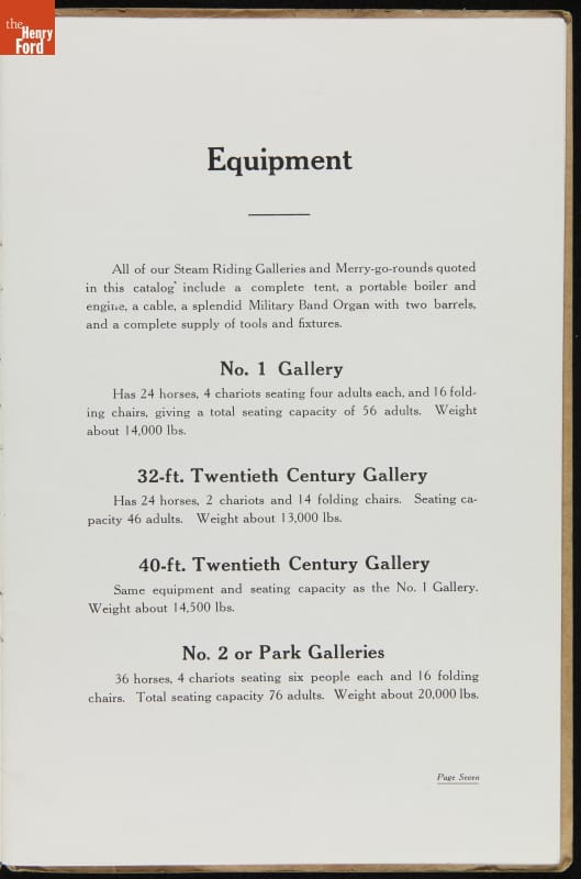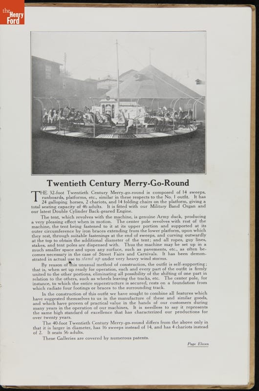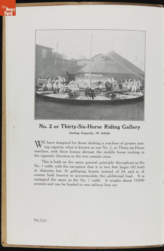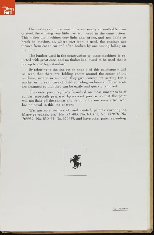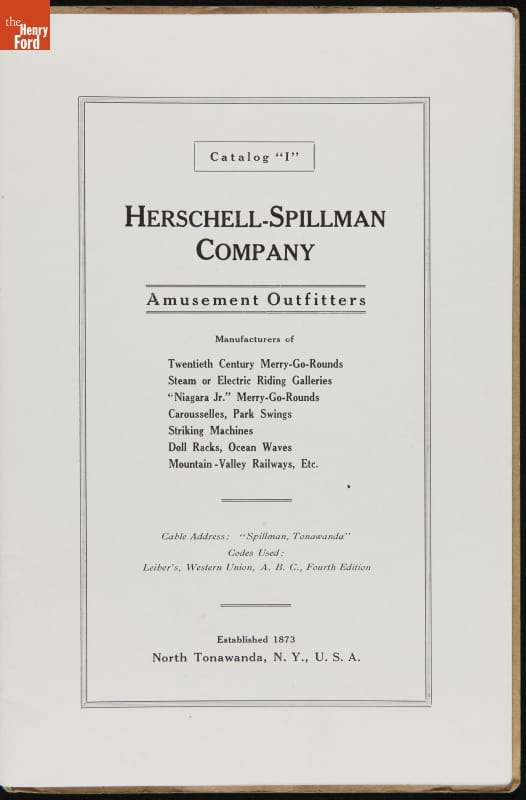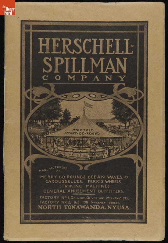 This catalog highlights the products of Herschell-Spillman Company, from portable merry-go-rounds to large stationary "carousselles." This company, one of the most popular and successful American carousel manufacturers of the early 20th century, combined a method of shop production to produce carved wooden animals with their expertise in steam engines and boilers for efficient operation of their merry-go-rounds and carousels.