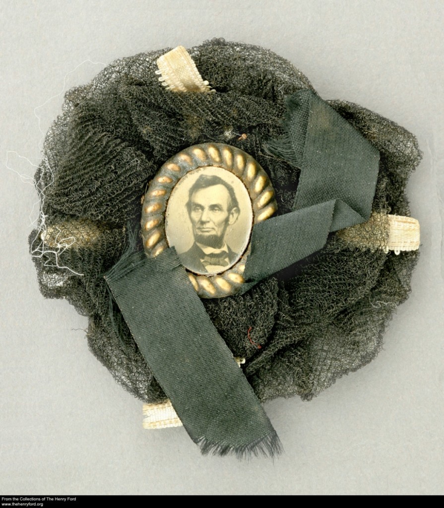 This mourning badge was handmade from a small oval tintype portrait of President Abraham Lincoln set into a rope-twist brass frame. The image is surrounded by a black crepe rosette, and decorated with black and white ribbons. This small button, just 2-3/8 inches in diameter, would have been worn during the spring of 1865 to express mourning for the recently assassinated president.