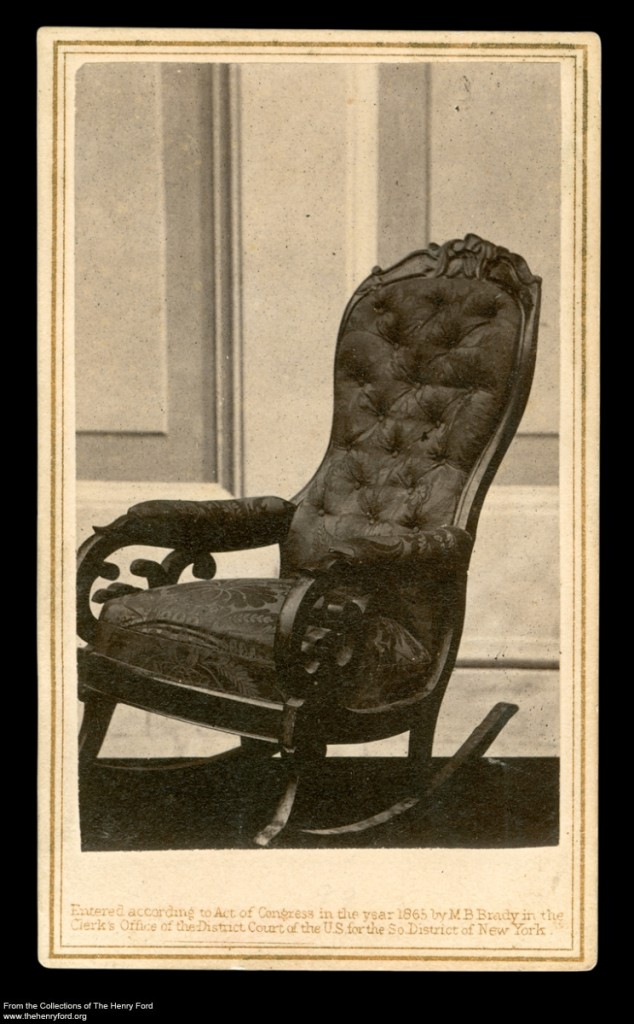 Abraham Lincoln sat in this rocking chair when he was mortally wounded at Ford’s Theatre in Washington, D.C. on the evening of April 14, 1865. Mathew Brady made the original glass plate negative of the chair for his Brady's National Portrait Gallery in Washington. Shortly after, Brady transferred many of his negatives to the photographic supply firm of E. & H. T. Anthony & Company of New York City to pay his debts. Anthony & Co. published this carte-de-visite photograph in 1865. At a time before television and internet news, this photograph helped people visualize events surrounding President Lincoln’s death. (The Lincoln assassination rocker is in the collections of The Henry Ford and is currently on display in Henry Ford Museum.)