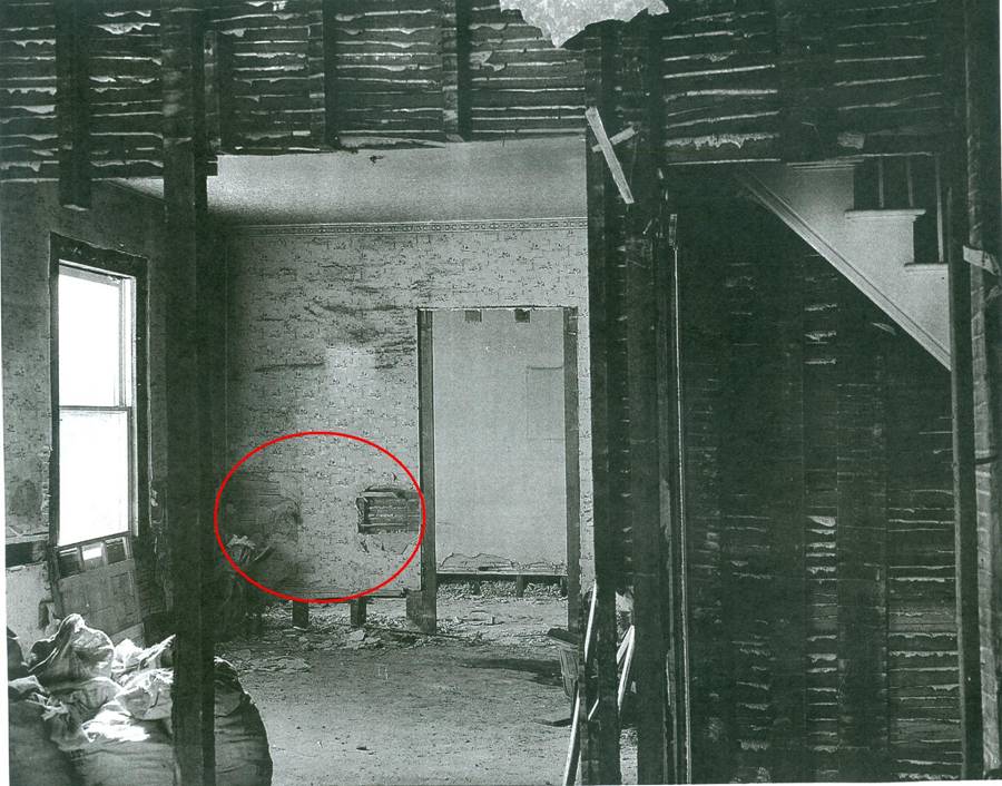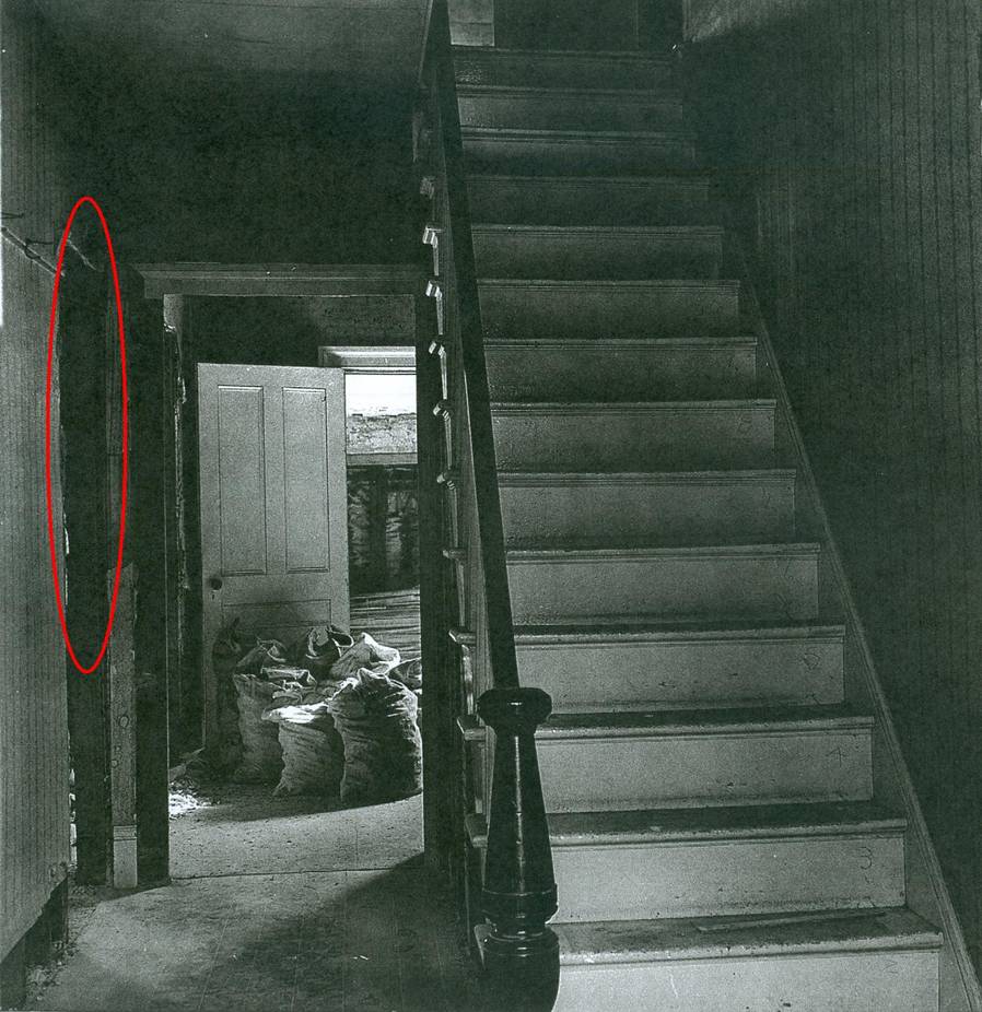 Looking into the kitchen from another angle, even more interesting features can be spotted. The wall with the doorway in the picture below shows a division in the kitchen, which in all likelihood was a pantry. So while it is unclear if the pantry wall in the picture is original to the house, there are several clues to help scholars determine a rough chronology. Many kitchens in the early Victorian era had no need for a pantry. After the Civil War, however, mass production and an increase in commercial products led to a need to store food and keep it organized. The Adams House as it stands today does indeed have a pantry, although not in the same location as the one depicted here. Like the other walls in the picture, the wall in question is made using plaster applied to strips of lath. This is the 19th-century equivalent of the beams and drywall system of today. All of the strips in the house are split laths rather than sawn laths, indicating that the interior wall is close to the rest of the house in terms of construction date. Laths that were sawn off of logs rather than stripped would illustrate a date closer to the 20th century and an increase in sawmill technology, when there was greater uniformity both in the form of houses and the materials that were used to make them. The pantry wall, with its construction indistinguishable from the rest of the original structure, could be original to the house or, if not built right away, a very quick addition afterwards.