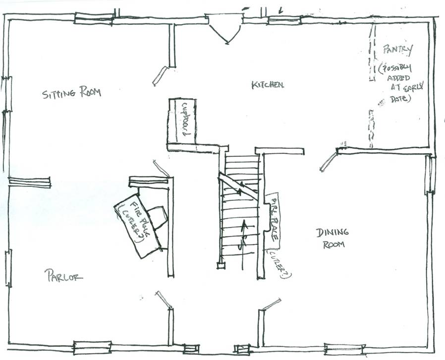 Houses are rarely static objects. As the years go by, people change, families grow, and structures pass into different ownership. Homes are adapted to meet the needs of their residents, and in doing so, those same dwellings are able to share their secrets with those that have a discerning eye. Consider, for example, this picture of the front entryway of Adams House, looking into the kitchen. The way to the kitchen is open, just as it is at Greenfield Village, but what about the opening to the left, immediately in front of the kitchen door? When we study the blueprint, it appears that this passage would lead into the sitting room, although it is not depicted in the 1876 interpretation of the Adams House in the Village. It is entirely possible that this passage was open, and the doorway to the kitchen solid wall, when the home was built in 1846, more than three decades before George Matthew Adams. The kitchen of the 1840s was a far cry from the kitchen of today. While modern kitchens are open and inviting, often combined with or indistinguishable from the dining room, antebellum kitchens were usually cut off from the rest of the house, a place that the family never exhibited and where guests were rarely allowed. In fact, it was more likely to have a passage from the main hallway lead into the sitting room than the kitchen. It might be the case that the door to the kitchen was added many years later, when homeowners insisted on a greater degree of convenience and changing domestic patterns made the kitchen into more of a social and familial gathering place.