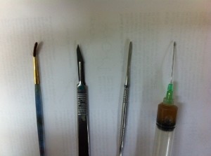 Forty-one areas of lifting veneer were identified. This damage was caused by the deterioration of the animal glue or hide glue (water soluble adhesive made from animal hides) that was used to adhere the veneer. Despite the fact that hide (or animal glue) glues are very strong, they absorb moisture and lose strength when humidity levels fluctuate. To reattach the veneer a syringe filled with warm water was used to soften the old adhesive so that it could be scraped out with a small spatula or scalpel.