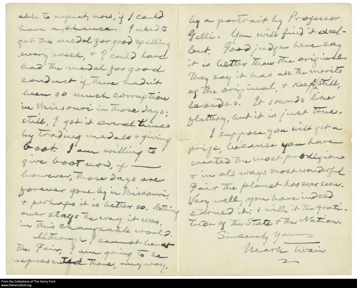 The auction collection was divided into hundreds of lots, and we carefully reviewed what was being offered. Contained in Lot 551 was a fascinating letter dated May 26, 1904, from Clemens to Governor David Francis of Missouri. Interestingly, the auction house had only published information from the first page of the two-page letter. They would not release the second page until we pressed them. And, it was the second page that revealed the “smoking gun.” The gist of the letter was to ask the Missouri-native if he would participate in the 1904 St. Louis World's Fair, organized to commemorate the 1803 Louisiana Purchase. Regretfully Clemens, who was living in Florence, declined the invitation because of his wife’s poor health. The friendly letter bears some of Mark Twain’s trademark humor. And, more significantly had a direct reference to the portrait in our collection. “Although I can not be at the fair, I am going to be there anyway, by a portrait of professor Gelli. You will find it excellent. Good judges say it is better than the original. They say it has all the merits of the original and keeps still besides.”