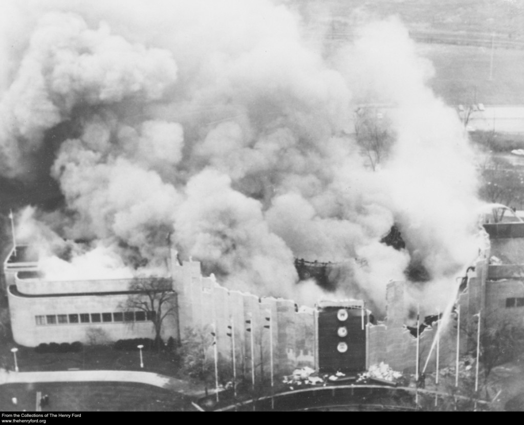 Tragically, the Ford Rotunda burned down on November 9, 1962, when a waterproofing sealant of hot tar accidentally caught the roof on fire. The intense heat caused the building to collapse and burn to the ground in less than an hour. Fortunately, a wing housing the Ford Motor Company Archives survived.
