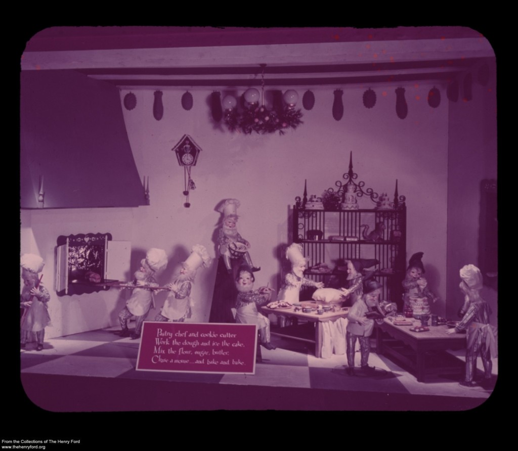 Over the years, these scenes became ever-more numerous and elaborate. Life-size storybook figures like Hansel and Gretel, Robin Hood, Wee Willie Winkie, and Humpty Dumpty pivoted back and forth in atmospheric Christmas and winter settings. In 1957, two animated scenes were added to the doll display: a Beauty Shop, where two beauty-operator elves “glamorized” a pair of dolls and a Dress Salon in which mechanical elves operated a sewing machine and iron. More displays were added in 1958. In the Pixie Candy Kitchen, animated workers turned out large chocolate-covered delicacies. A Bake Shop featured animated bakers kneading dough, trimming pies, mixing cakes, and baking bread and cookies. An animated fiddler and banjo player accompanied a group of square-dancing elves in a barn dance scene. In 1960, jungle animals in cages with peppermint-stick bars joined the other animated scene