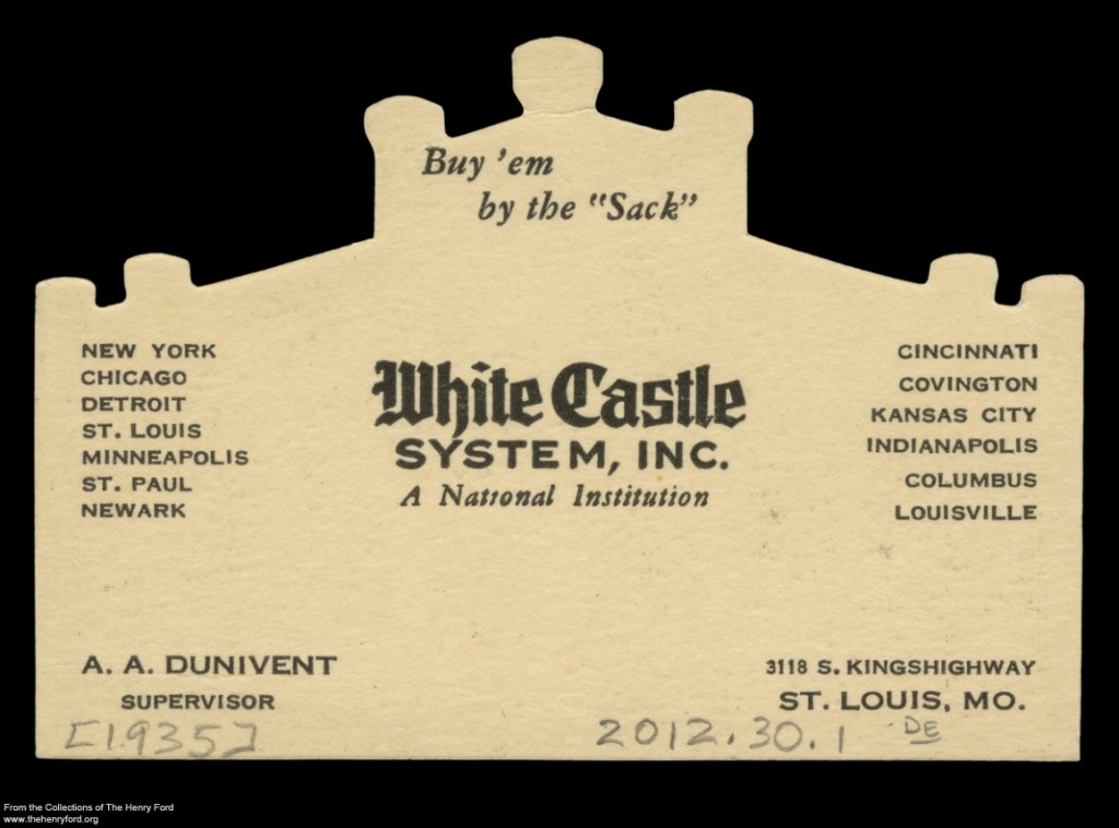White Castle is one of the fast food restaurants highlighted in the Driving America exhibit in Henry Ford Museum. The museum's collection contains a stained glass sign from a 1930s White Castle restaurant, a restaurant uniform from the 1980s, and promotional items from the 1950s-1995.