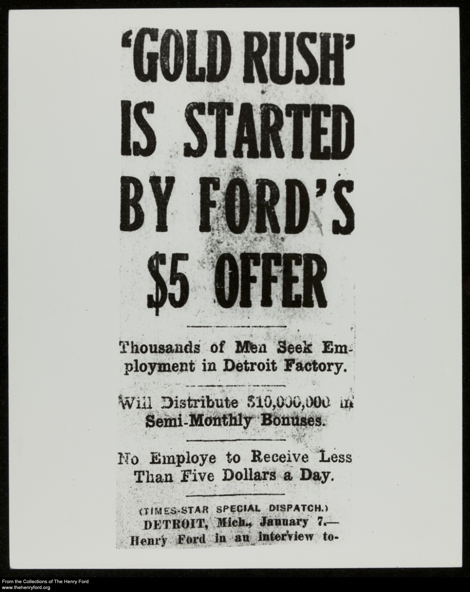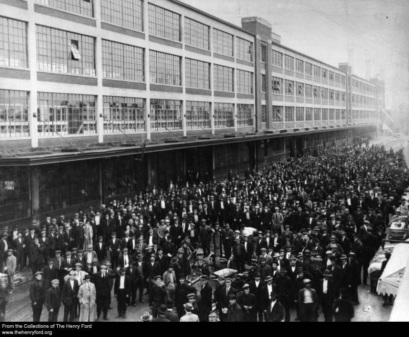 If the need to retain workers was a partial motivation for the Five-Dollar Day, then the solution may have worked too well. Within days of the announcement, thousands of applicants came to Detroit from all over the Midwest and entrenched themselves at the Ford’s gate. The company was overwhelmed, riots broke out, and the crowds were turned away with fire hoses in the icy January weather. Ford announced that it would only hire workers who had lived in Detroit for at least six months, and the situation slowly came under control.