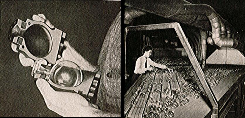 90.349.1 (THF88991). Right: A retrofitted ribbon machine shapes glass ornament bulbs at Corning’s Wellsboro, Pennsylvania plant in 1940. “Popular Science,” January 1941, Benson Ford Research Center.