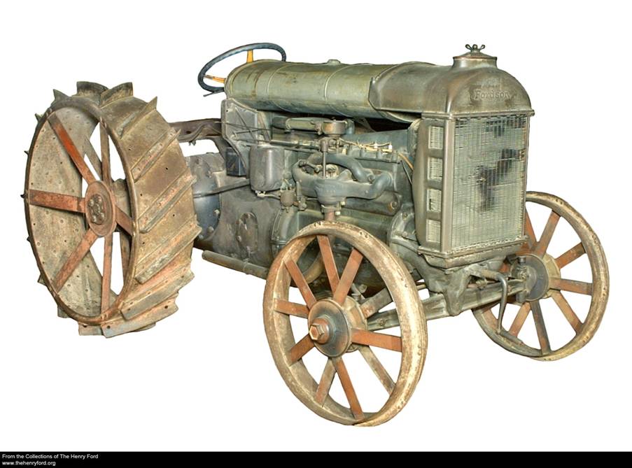 The thing most identified with Henry Ford is the Model T, a car introduced in 1908 that was reasonably priced, reliable, and effective on the bad roads of the day. Three sets of collections items help tell this story. On the Way to the Model T shares some artifacts that show how Henry’s career progressed, such as the 1896 Quadricycle, the first car Henry ever built, and a 1901 photograph showing the race (featured above) that helped Henry gain notoriety and financial backing for his auto ventures. The Model T set shows a few of the Model T’s in the collections of the Henry Ford, including an early 1909 version, and also shows how quickly the Model T was assimilated into all aspects of daily life, from rural families to ingenious work applications. Post-Model T covers many of Henry’s business activities following the Model T, including the introduction of the V-8 engine and war production at Willow Run.