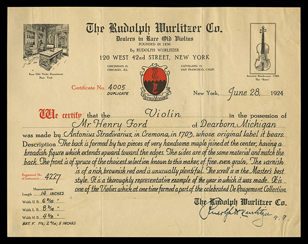 Henry would add to his personal collection over the next year, selecting those instruments whose tonal qualities best appealed to him. By January 1926, Ford had purchased a total of seven exquisite Italian-made violins. Five of these violins—crafted by Cremona’s master violinmakers during the 17th and 18th centuries—came to Ford through Wurlitzer. These five were Ford’s finest. The remaining two violins Ford purchased through Ole H. Bryant, a Boston violinmaker who served as principal repairer for the Boston Symphony Orchestra.