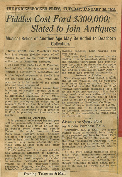The press took note of Henry Ford’s classical violin acquisitions. This Albany, New York newspaper article, published in January 1926, exaggerated the price Ford paid for his violins. (The figure was probably closer to $100,000.) But the article clearly linked Ford’s classical violin purchases to his interest in “old tunes and fiddlers.” (THF 109925)