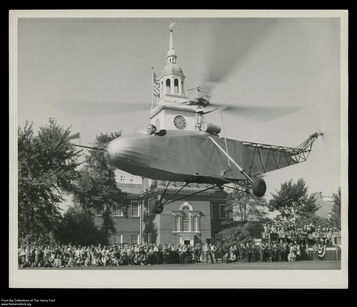 You may know that the Sikorsky VS-300A helicopter on display in Heroes of the Sky in the Henry Ford Museum was the first practical helicopter in the United States. Inventor Igor Sikorsky piloted this craft for about an hour and a half on May 6, 1941, setting a world endurance record. In 1943, as shown in this photograph, Sikorsky demonstrated the machine on the front lawn of the Henry Ford Museum just before donating it. Attendees at the event included Henry and Clara Ford, Henry Ford II, Charles Lindbergh, and Les Morris, Sikorsky’s chief test pilot. We’ve just digitized a number of photos related to the ceremony, Sikorsky, and helicopters in general—view them all in our digital collections.