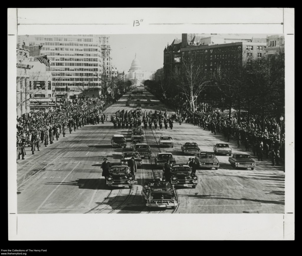 On January 20, 1961, John Fitzgerald Kennedy’s swearing-in as 35th President of the United States was followed by an official parade up Pennsylvania Avenue to the White House. As shown in this photograph, President Kennedy and First Lady Jacqueline rode in a 1949 Lincoln that had served Presidents Truman and Eisenhower. The presidential limousine we generally associate with President Kennedy was not completed until June of that year.