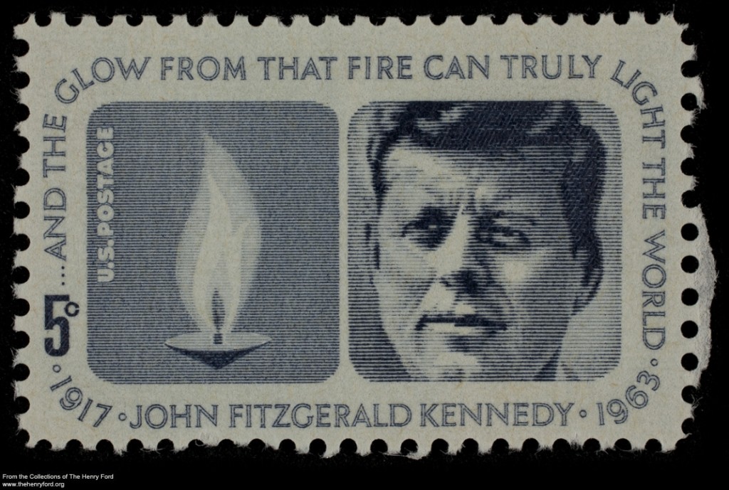 Stunned and disillusioned Americans embraced commemorative items relating to President Kennedy after his death. These items, including books, magazines, phonograph records, and this postage stamp, helped people mourn and enabled them to re-connect with their charismatic—and now deceased—leader. Commemorative items recalling the optimistic era when John F. Kennedy was President and Jacqueline Kennedy was First Lady are still popular today.