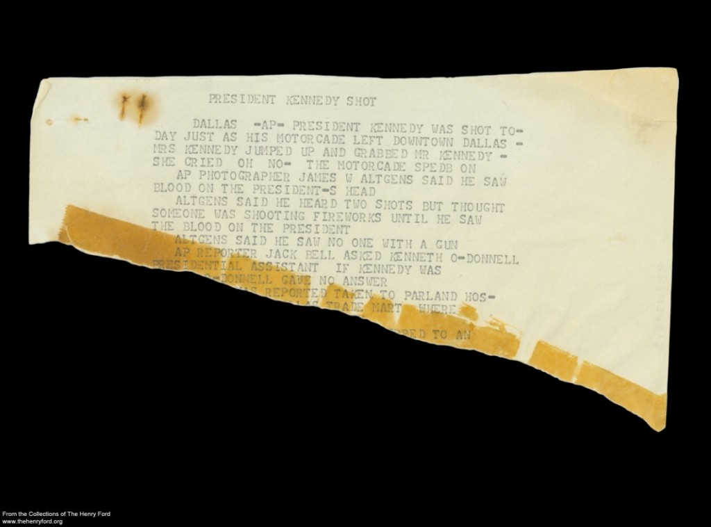 (Object ID: 97.1.1798.3) Teletype Message with Wire Service News Coverage of John F. Kennedy Assassination, November 22, 1963.