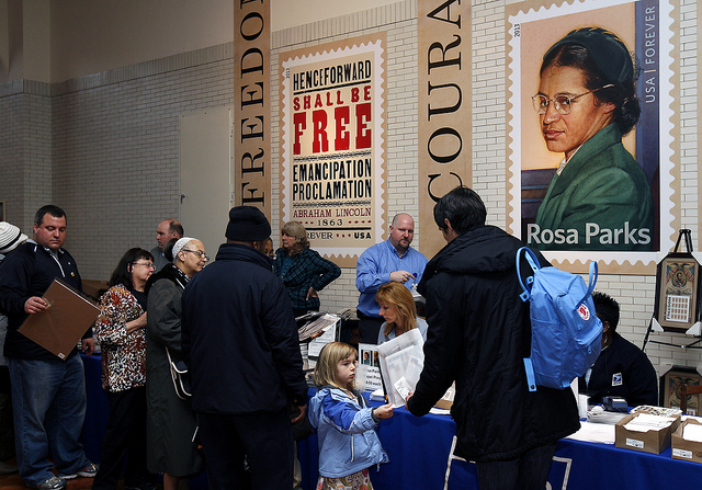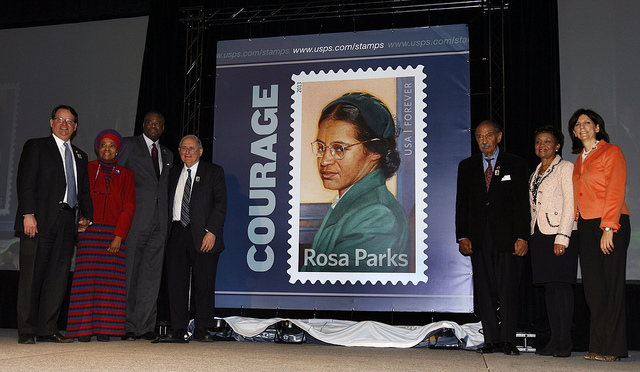 The morning's activities were highlighted by an unveiling of the new Rosa Parks Courage stamp from the United States Postal Service.