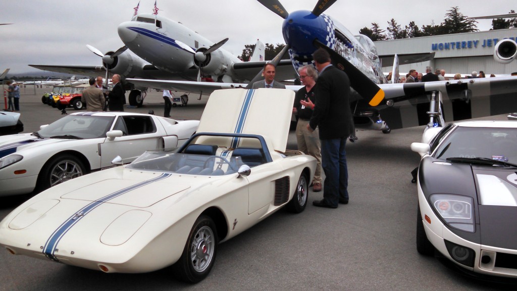 Our week began with Gordon McCall’s Motorworks Revival, a sort-of kickoff celebration held at the Monterey Jet Center on Wednesday, August 13. The event staff took full advantage of the airport setting – Mustang I was displayed in front of a P-51 Mustang fighter airplane. There were exotic supercars, over-the-top hot rods (including one powered by a Packard V-12 marine engine – yes, a boat engine), and even a few racing celebrities. We were especially pleased when Dan Gurney stopped by to say hello. Mr. Gurney drove Mustang I for Ford Motor Company at Watkins Glen in 1962, and he was happy to see “his” little roadster again.