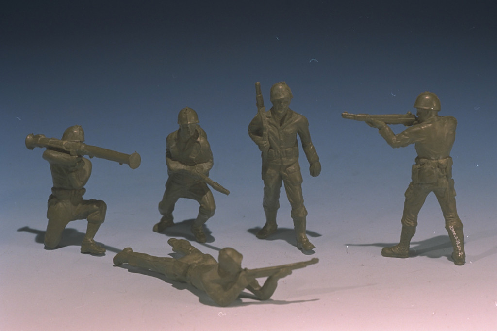 In the 1950s, toy makers began producing military toys that celebrated World War II as a historical event. Along with Civil War and Robin Hood playsets, catalogs featured playsets that allowed children to reenact World War II battles. Ship models were advertised as a way for boys to relate to their veteran fathers. Bags of cheap hard plastic army men, two or three inches tall, were a common toy to 1950s boys, allowing them to restage World War II battles. This type of war play continued into the 1960s and culminated with the introduction of Hasbro's GI Joe doll in 1964. While initially inspired by a television show, GI Joe came to represent the average soldier, evoking memories of fathers' experience in World War II and the Korean War. The point was to imitate the real world of adults in the military and connect fathers with sons.