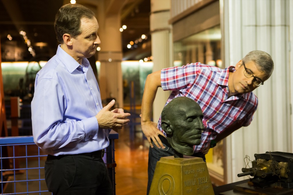 In fact, the artifacts from the collection are some of the biggest stars of our television show, The Henry Ford’s Innovation Nation, so the Special Access team is very busy during filming. The first episode of season 2 – filmed in part on this day in July – features the work of Nikola Tesla. I brought several objects to “center stage” for the shoot, including the death mask of Nikola Tesla, shown above. I worked with our Exhibits team to move the electroplated copper mask and its beautifully designed pedestal (which together weigh more than 50 pounds!) from a case in the Made in America exhibition to a sturdy table. It joined several objects that I had moved temporarily from collections storage to the museum for filming:
