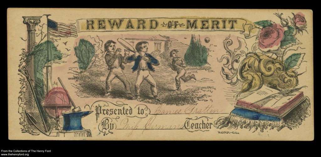 Giving students a new perspective on education through our One-Room School program has been so rewarding. It’s also been fun for us to learn more about the history of education and to sift through The Henry Ford’s many school-related artifacts. In the archives, we found many rewards of merit. During the nineteenth century, teachers rewarded students for excellent work or good behavior with these paper cards. Probably the most historically significant reward of merit we found was a handmade one given by 17-year-old teacher, Alexander McGuffey, to his student, Sarah White, in 1833. Alexander McGuffey was the younger brother of William Holmes McGuffey, originator of the McGuffey Readers textbook series and he himself the writer of the Fifth and Sixth Readers.