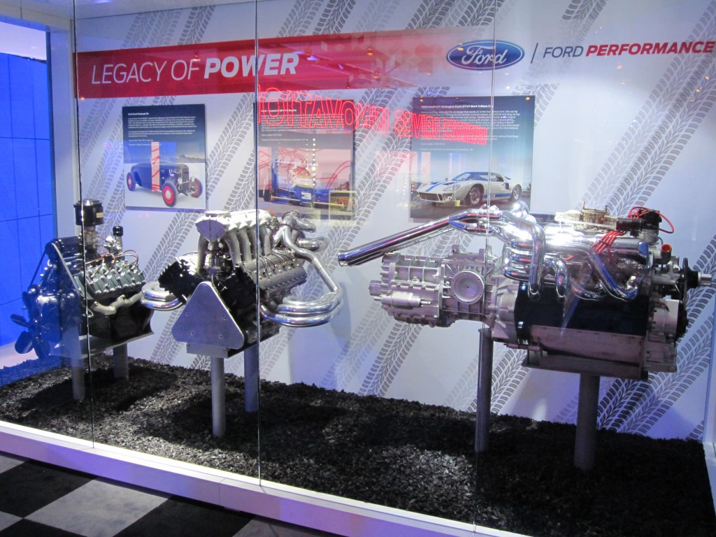 And on the subject of Ford performance, visitors to the Blue Oval’s upstairs gallery – on the “bridge” over the exhibit’s entrance – will see a fascinating display of Ford Racing photos, models and memorabilia starting with Henry Ford’s first race in 1901 and carrying into the present day. Of special note are a pair of V-8 engines: a circa 1966 427-cubic inch unit of the type that gave Ford its first Le Mans win, and a circa 1980 2.6-liter Cosworth DFX similar to those that dominated the Indianapolis 500 for a decade. Both engines are from the collections of The Henry Ford.