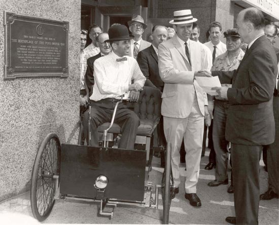 What DeAngelis thought would be a one-winter project turned into three years of nights and weekends. He was able to source some of his parts from lawn mower catalogs, and some from antique shops, but most he made himself. While the replica stayed remarkably true to the original, DeAngelis made a few concessions to safety and reliability. Most notably, he gave his replica a brake – something Henry’s Quadricycle never had. The work was finished by June 4, 1963, when DeAngelis drove his replica along the same route Henry Ford took during the original Quadricycle’s first drive on June 4, 1896.