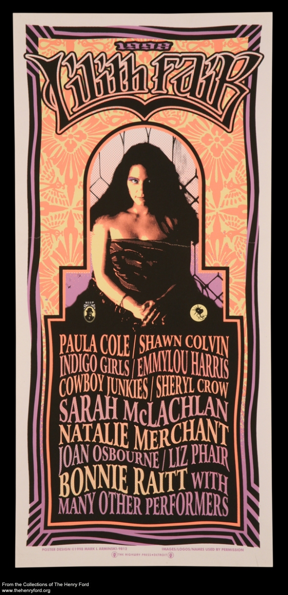 Singer Sarah McLachlan was frustrated by conventional wisdom—concert promoters and radio stations had long refused to feature two female musicians in a row. McLachlan took action, organizing a concert tour and traveling music festival called Lilith Fair (poster picture above). Featuring only female artists and female-led bands--including well-known performers and emerging artists--the hugely successful Lilith Fair took place the summers of 1997 through 1999.