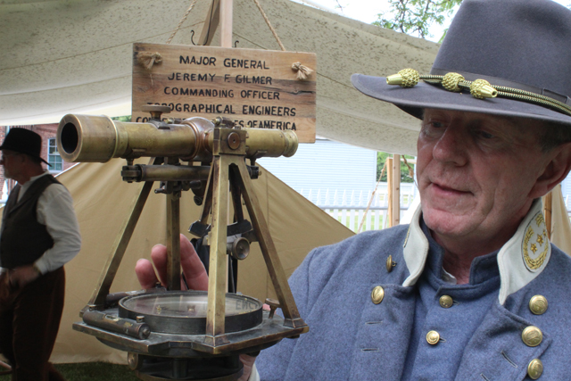 Larry O'Donnell acquired a pre-Civil War transit made by Henry Ware of Ohio, which seemed to prompt his involvement. He's been reenacting for five years and was at Greenfield Village as part of the 4th Texas. Larry portrays General Jeremy Gilmer who was a topographical engineer. Surveying equipment was an essential tool during the Civil War. It was common for troops to build a bridge, retreat across it, then blow it up so opposing troops couldn't follow. In real life, Larry is a member of the Michigan Society of Professional Surveyors, a group that has an educational component that allows Larry and other members to borrow historic equipment to share with the public at events. He had some of that equipment at the event, too.